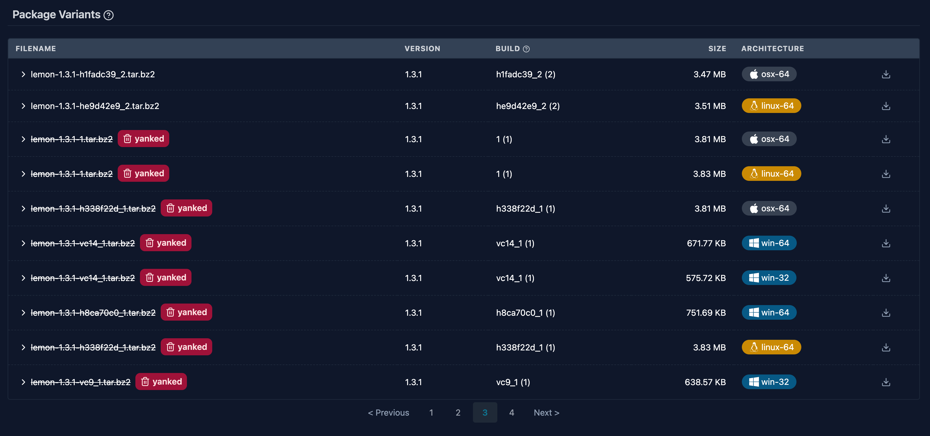 At prefix.dev we added some handy visualizations to the packages to show packages that were patched or “yanked” (marked as broken). For example, the lemon package has a few versions that didn’t work well: